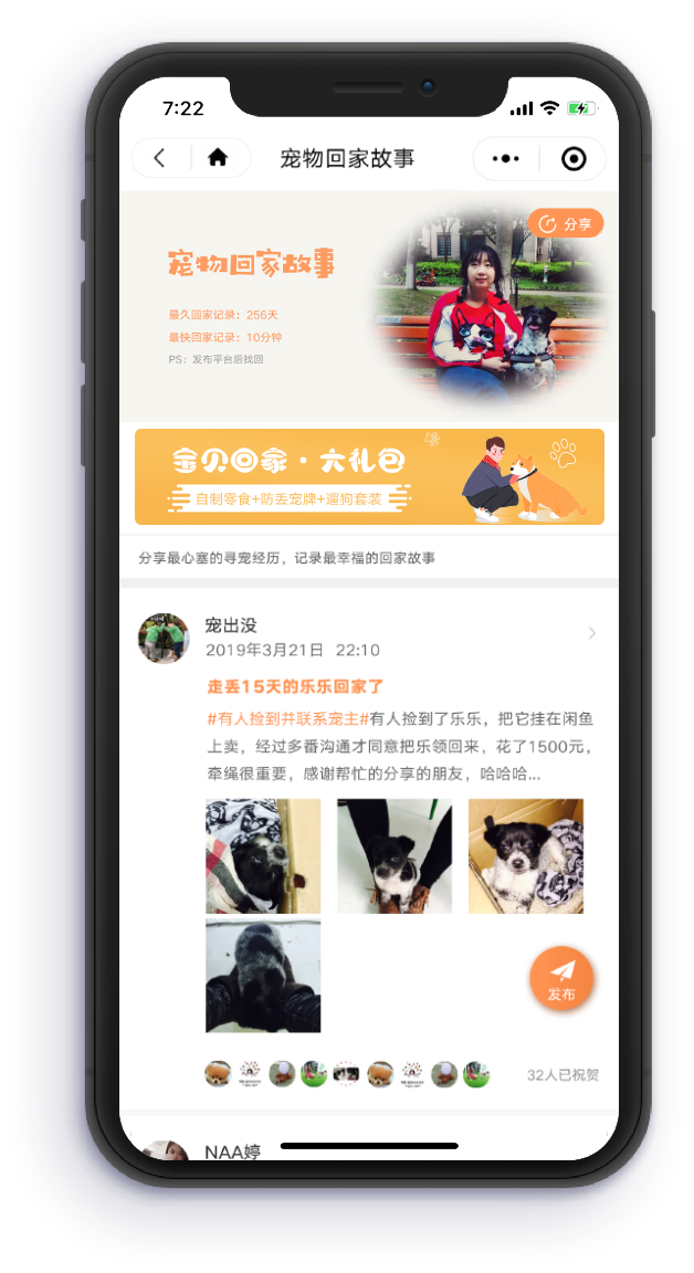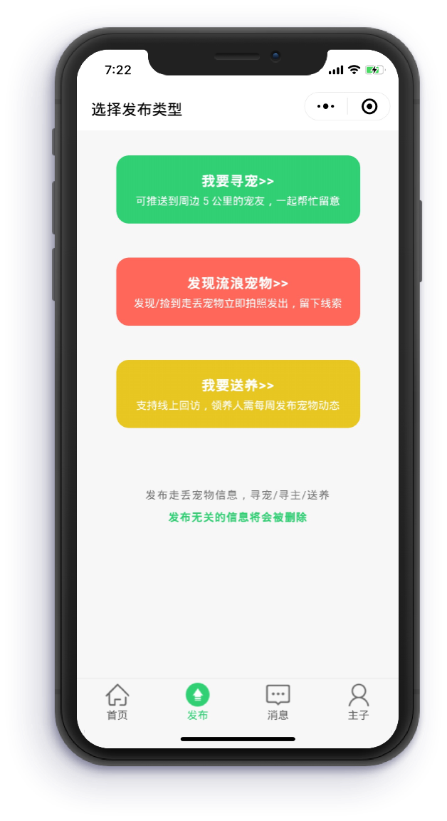 走丢宠物信息发布,自动推送到周边5公里的用户